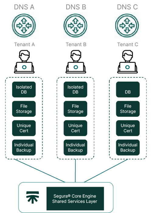 Segura® Multi-Tenant offers a shared-instance architecture that ensures full data and configuration isolation for each tenant, with separate database schemas, file structures, backups, and DNS access — all managed centrally and securely.